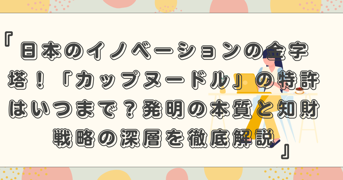 本記事では、カップヌードルにまつわる特許の歴史をひも解きながら、特許の権利期間の基本ルール、そして権利が切れた後に企業が取るべき知財戦略の深層まで、弁理士の視点から深く掘り下げて解説していきます。